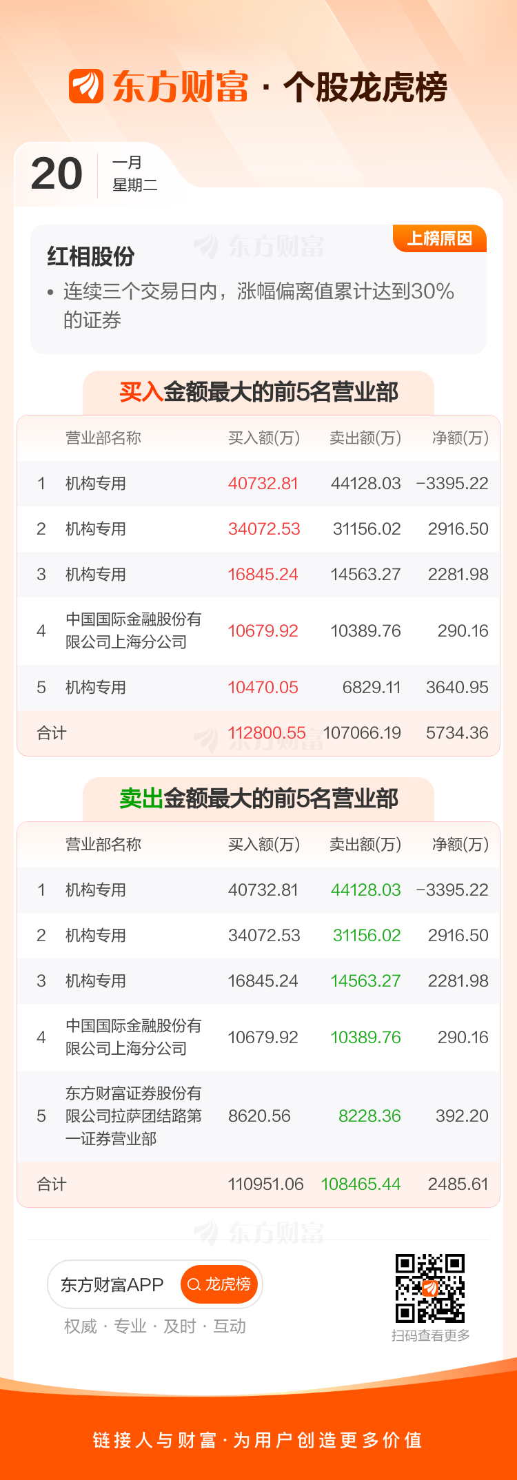 交易所2026年1月20日公布的交易公开信息显示,红相股份因成为日换手率达到30%的前5只证券、连续三个交易日内,涨幅偏离值累计达到30%的证券上榜。红相股份当日收报18.11元,涨跌幅0.67%,偏离值43.24%,换手率43.24%,成交额38.76亿。异常期间1月16日至1月20日,期间涨幅29.08%,累计偏离值31.09%,区间成交额106.27亿。