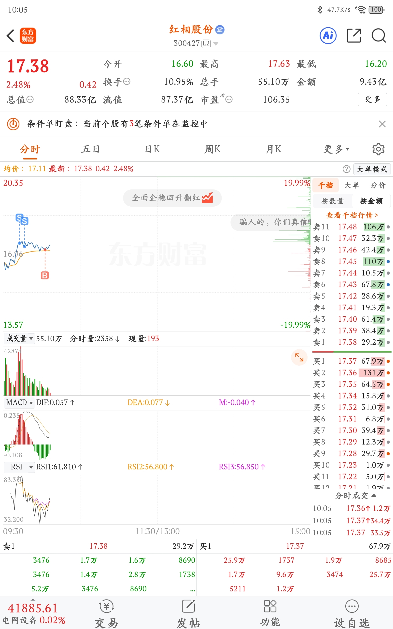 $红相股份(SZ300427)$ 一来一回饭钱到手