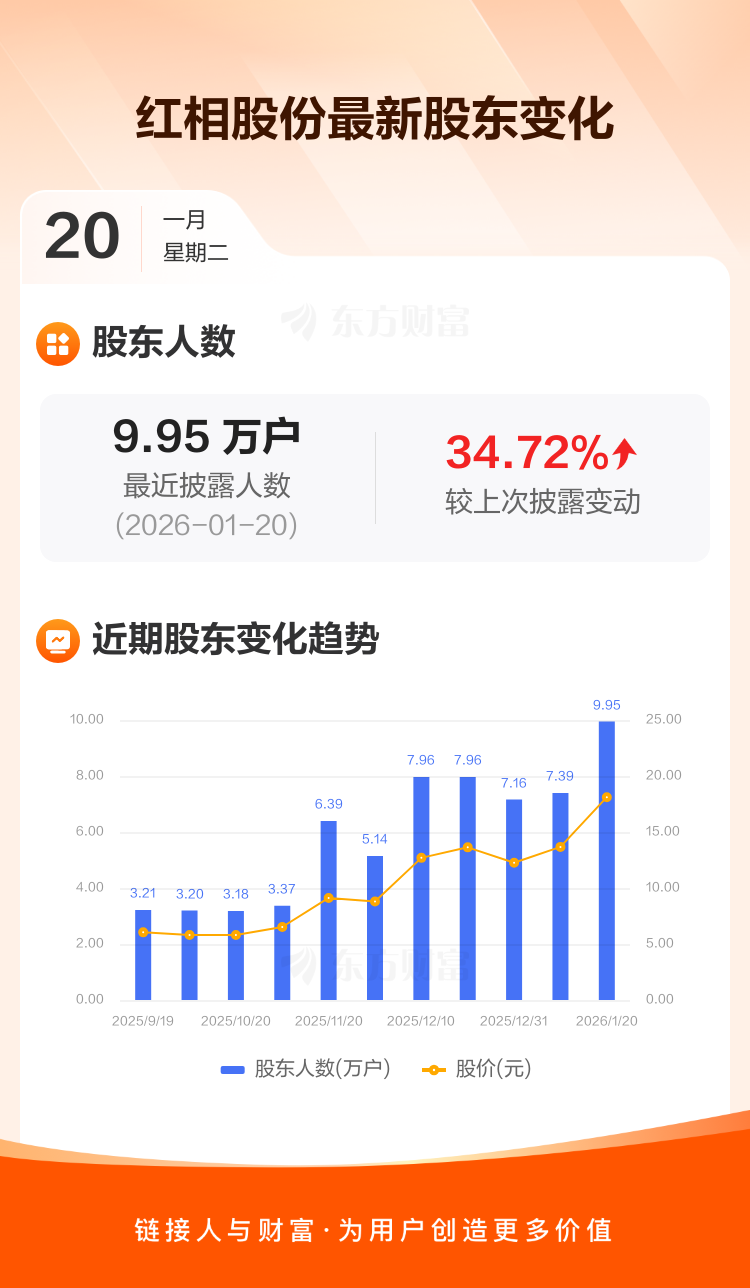 红相股份最新披露数据显示,截至1月20日公司股东户数为9.95万户,较上期(2026年1月9日)增加2.57万户,增幅为34.72%。户均持有流通股数量由上期的6809股下降至5054股,户均持股金额由上期的9.31万元减少至9.15万元。