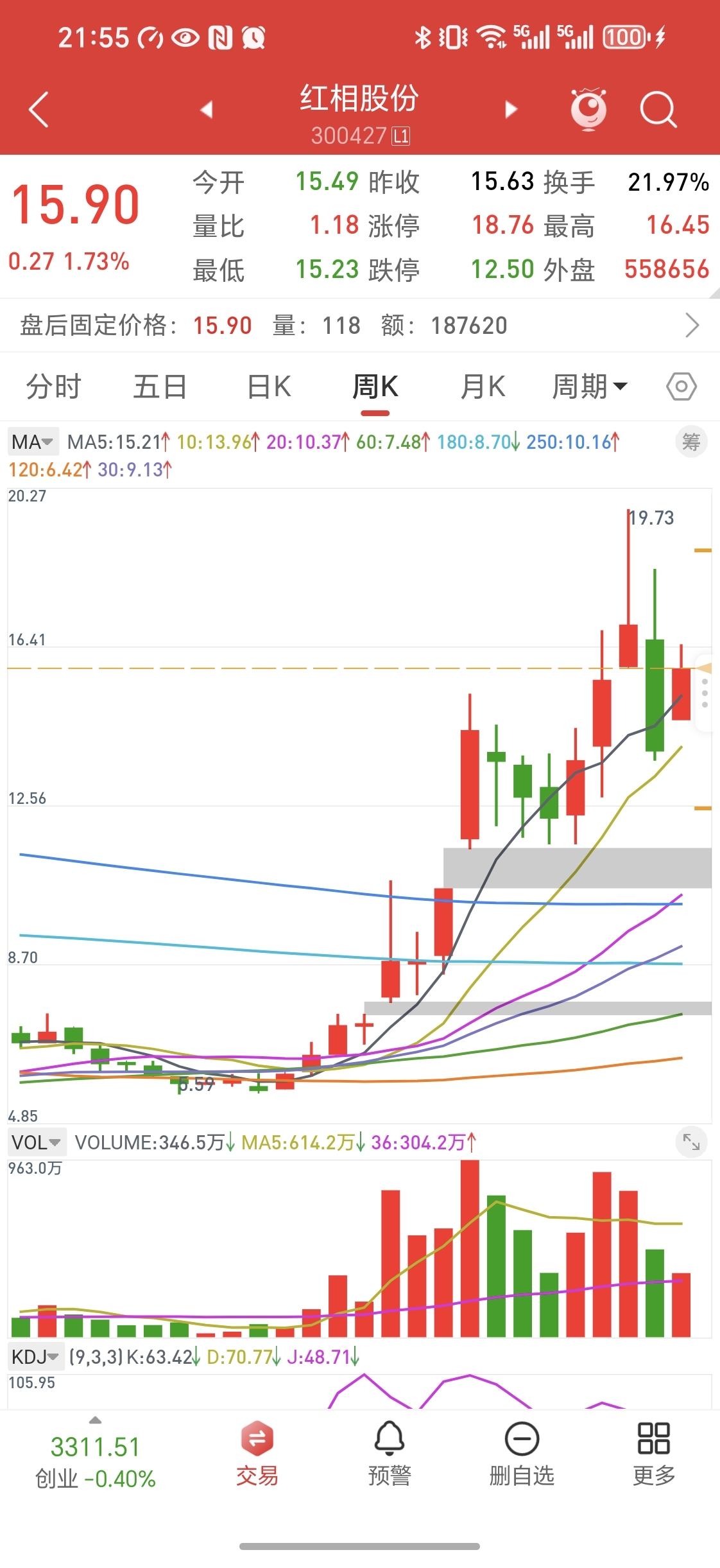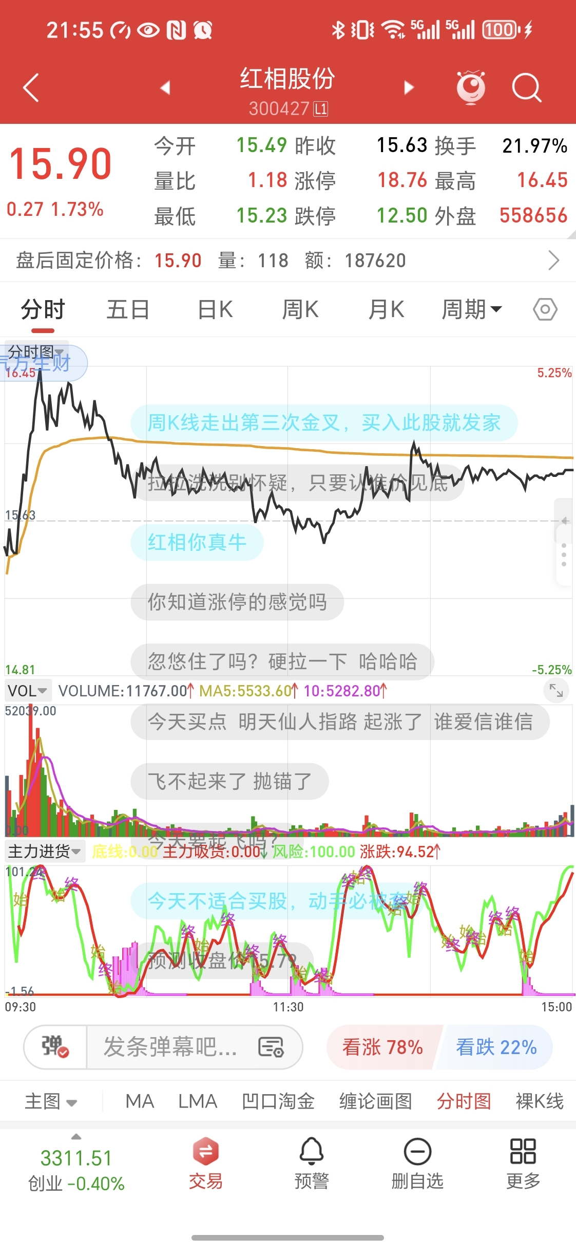 $红相股份(SZ300427)$ 红相今天的走势有惊无险,早盘低开向下迅速拉升到16.45,本以为在均线上做个盘整,一举突破17元,也做好17元高抛的准备,可事与愿违,忽然拐头向下,猛地急杀跌破均价线,全天在线下震荡,午后试着突破,也上涨无力,最后勉强收在了均线上方,带上下影线的小阳线。三连阳,缩量上涨,收平量。主力溜了1400多万,散户进了不少,这对明天的走势是一个不小的考验。周线反包还是有预期的。