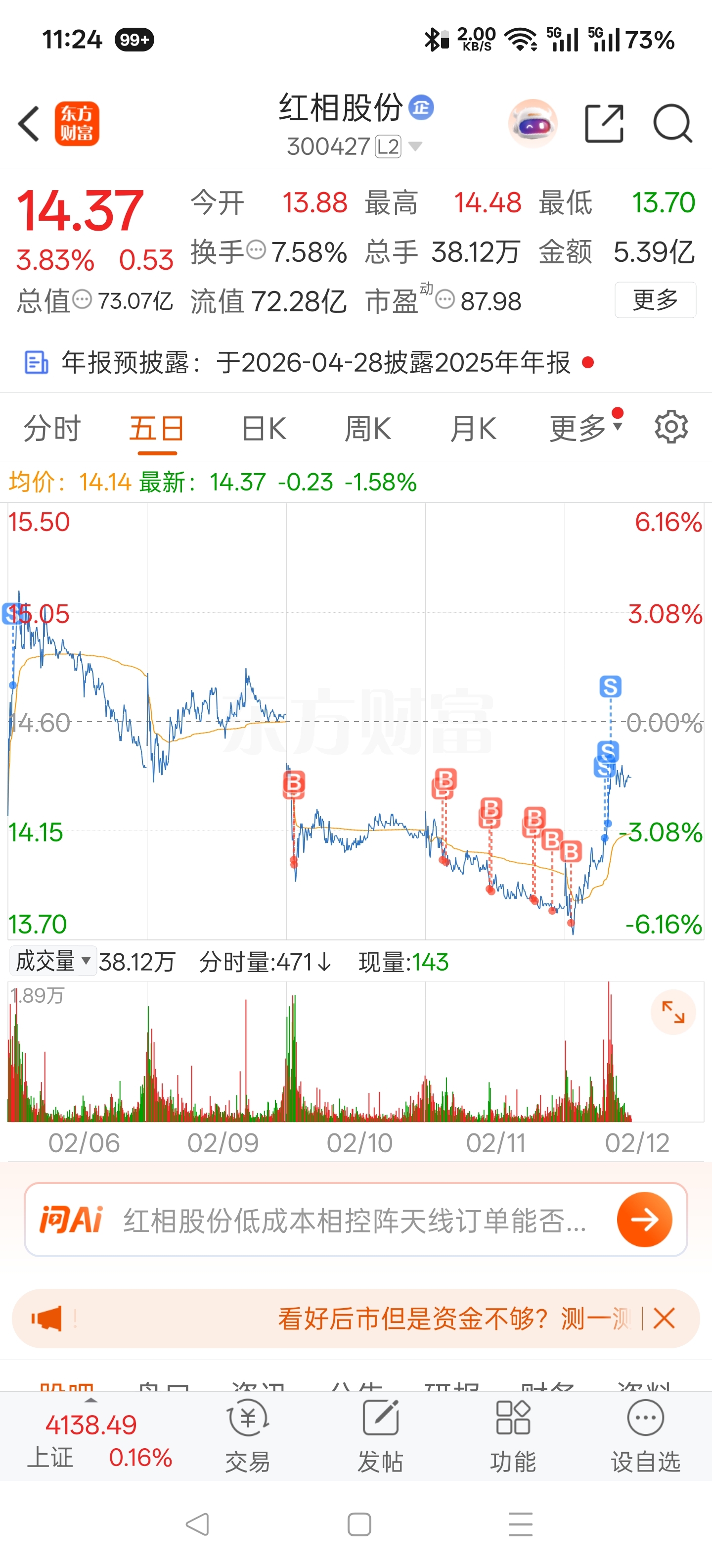$红相股份(SZ300427)$ 收个过年红包,马年再见。