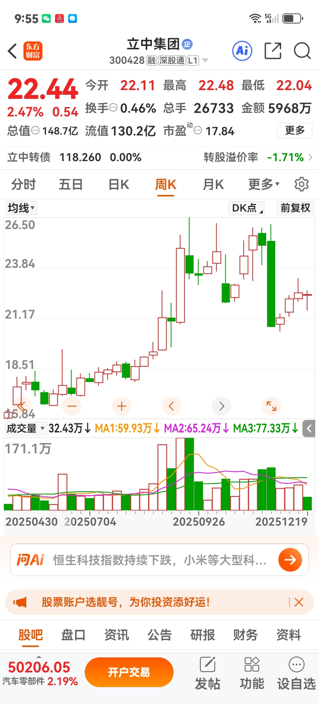 $立中集团(SZ300428)$ 今天收盘站上22.53,周线收阳