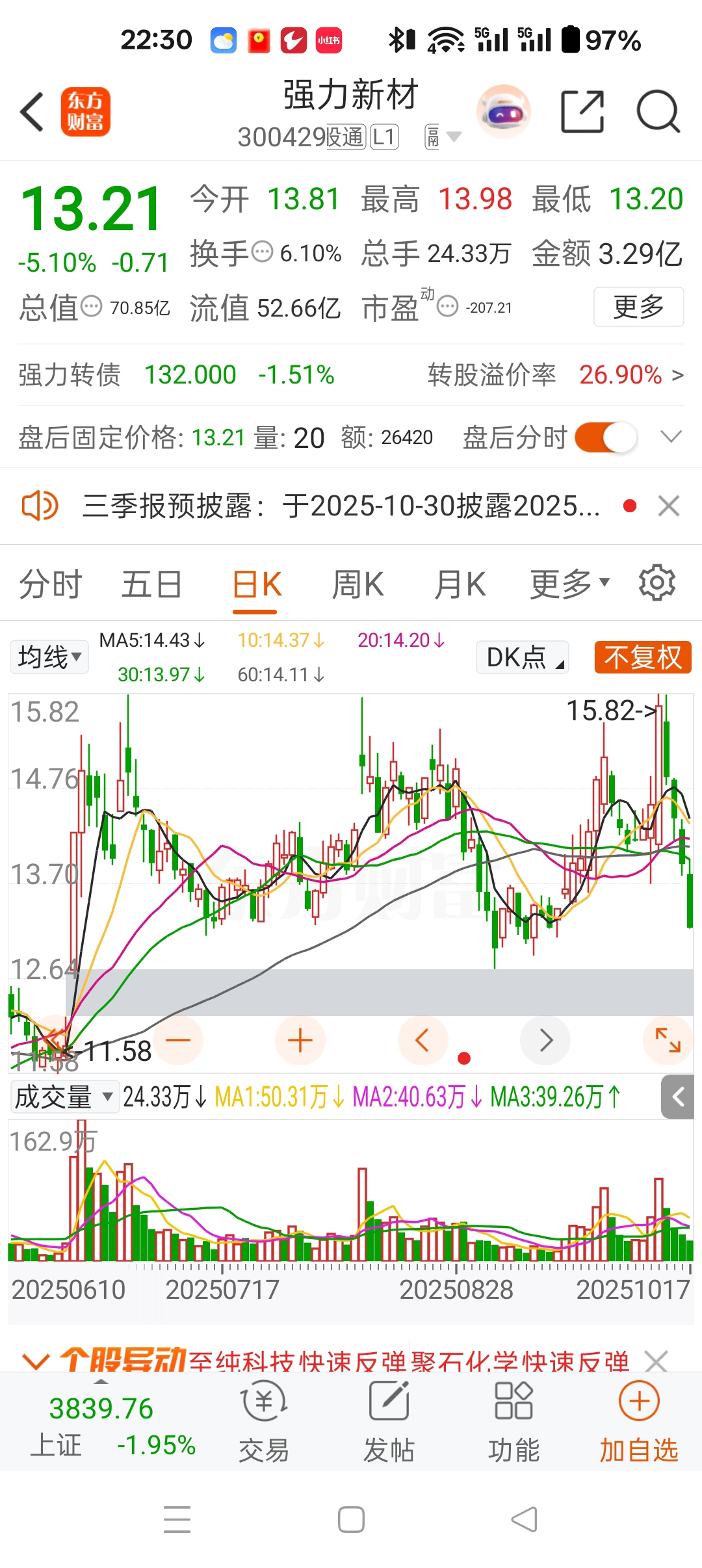 $强力新材(SZ300429)$ 难怪最近跌这么狠!原来今天刚补完最近13.43缺口,才发现下面还有一个11.89的大缺口。所以,这股最近绝对不能碰!需等补完11.89这个缺口后站稳了,才能考虑进来