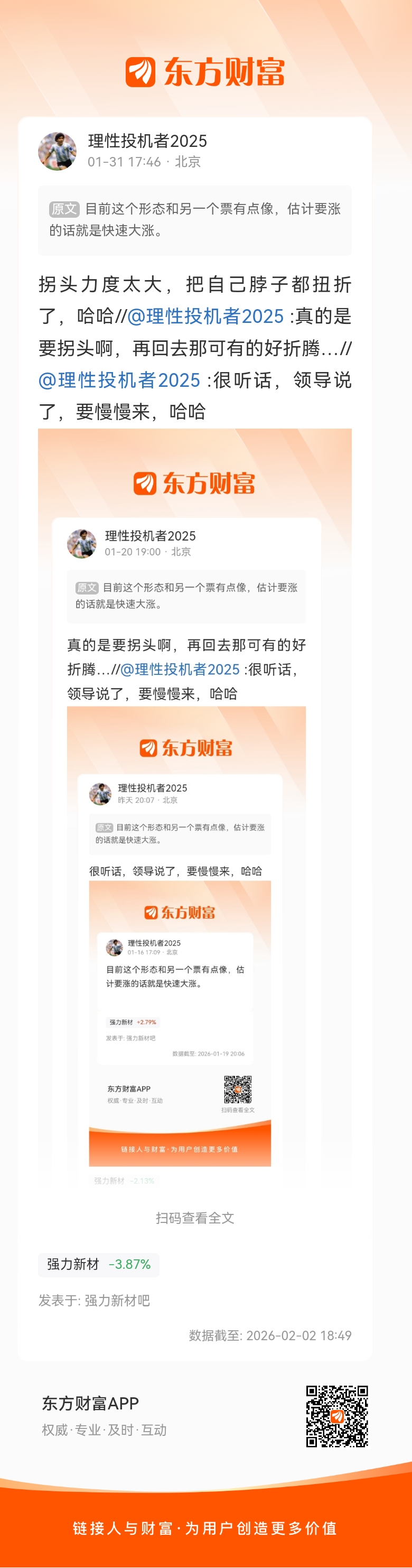 温馨提示: 1.根据《证券法》规定,禁止编造、传播虚假信息或者误导性信息,扰乱证券市场;2.用户在本社区发表的所有资料、言论等仅代表个人观点,与本网站立场无关,不对您构成任何投资建议。用户应基于自己的独立判断,自行决定证券投资并承担相应风险。《东方财富社区管理规定》