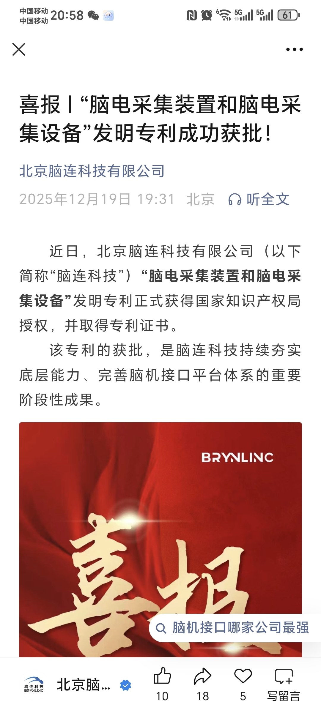 $诚益通(SZ300430)$ 诚益通子公司脑连科技脑机接口喜报来了