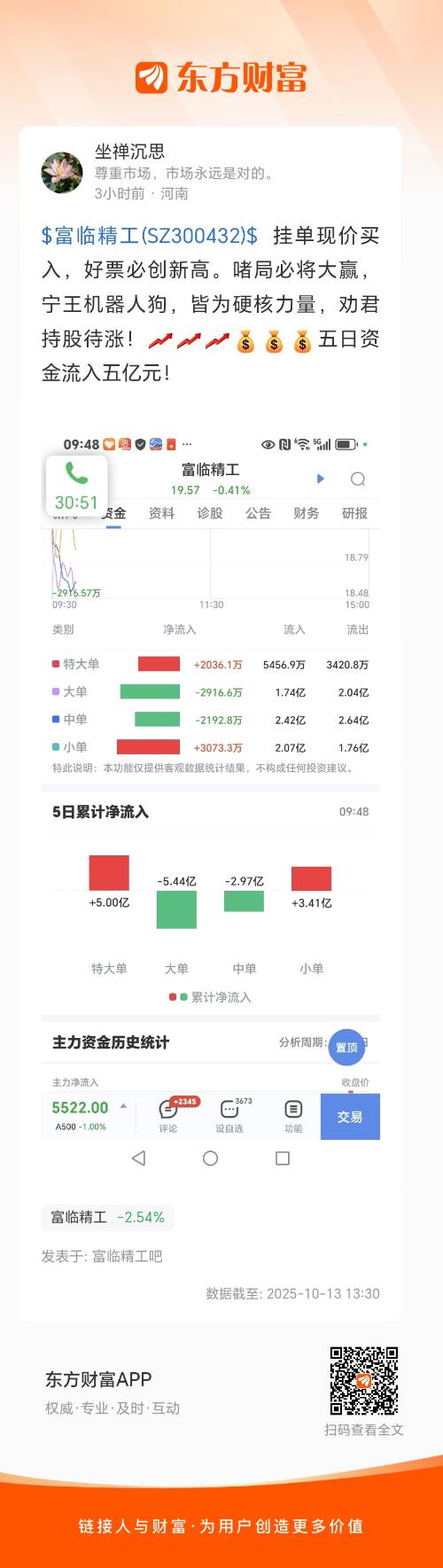 $富临精工(SZ300432)$  挂单现价买入,好票必创新高。啫局必将大赢,宁王机器人狗,皆为硬核力量,劝君持股待涨!五日资金流入五亿元!