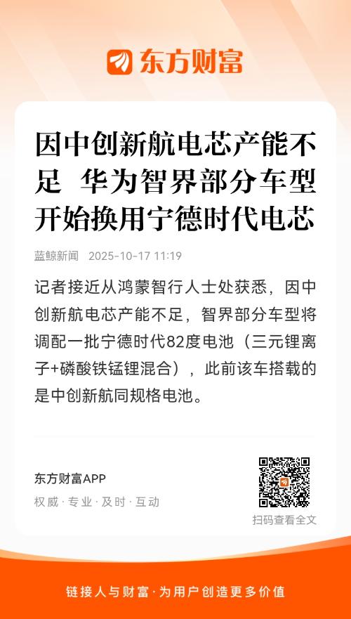 记者接近从鸿蒙智行人士处获悉,因中创新航电芯产能不足,智界部分车型将调配一批宁德时代82度电池(三元锂离子+磷酸铁锰锂混合),此前该车搭载的是中创新航同规格电池。两品牌电池的性能、使用寿命及功能均符合华为“巨鲸”电池平台标准,质保政策保持一致。据知情人士表示,此举旨在加快交车,保障用户享受国家购置税减免政策(今年减3万,明年减1.5万)。该人士还称,宁德时代电芯成本高于中创新航,车辆售价保持不变。(蓝鲸新闻翟智超)