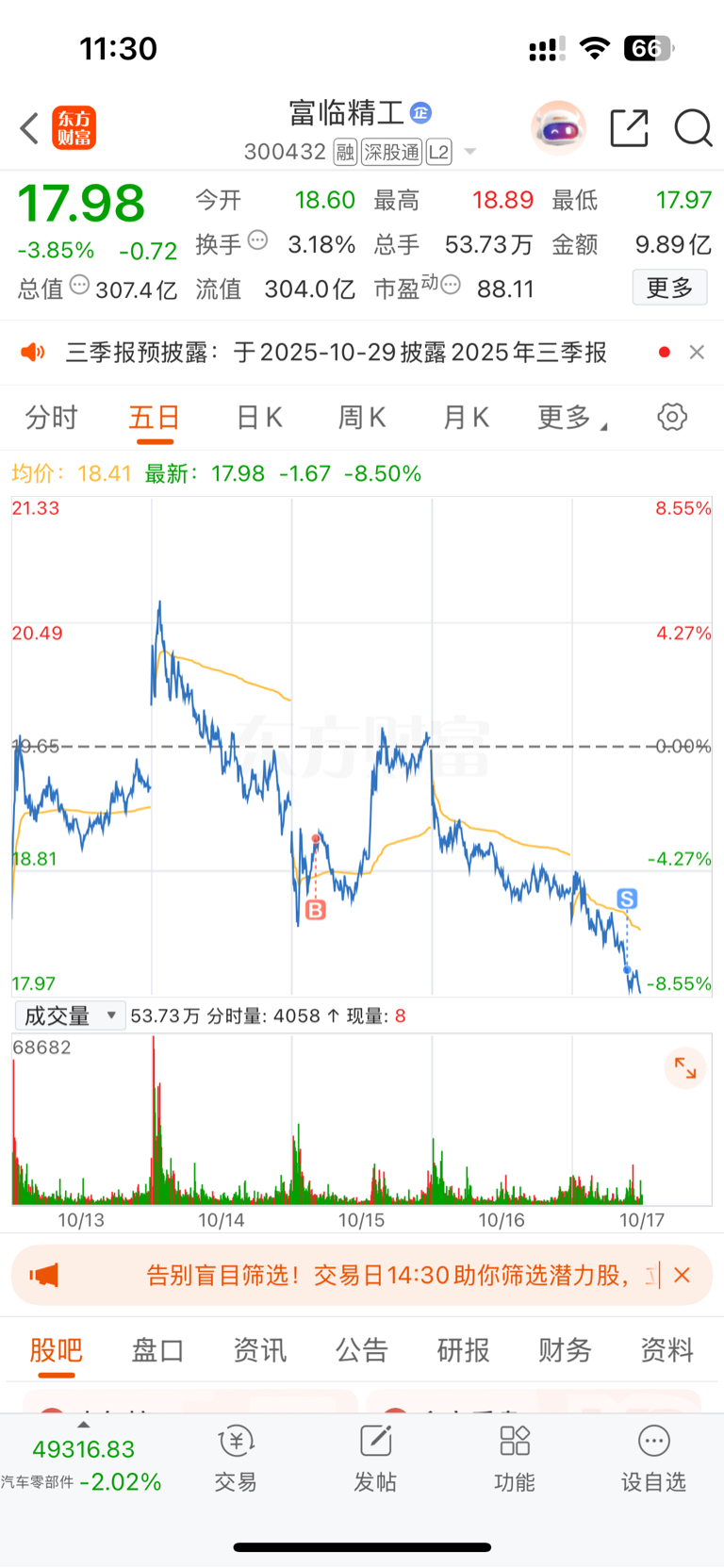 $富临精工(SZ300432)$ #炒股日记# 昨天已说过破18.27支撑位赶紧跑,前天进的昨天开盘没跑套位了。今天没怎么盯这个等我一看居然杀到18.14赶紧出了。下一个支撑14.32。上方压力18,27。言尽于此