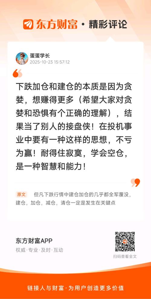 学长厉害,谢谢分享//@蛋蛋学长 :下跌加仓和建仓的本质是因为贪婪,想赚得更多(希望大家对贪婪和恐惧有个正确的理解),结果当了别人的接盘侠!在投机事业中要有一种这样的思想,不亏为赢!耐得住寂寞,学会空仓,是一种智慧和能力!