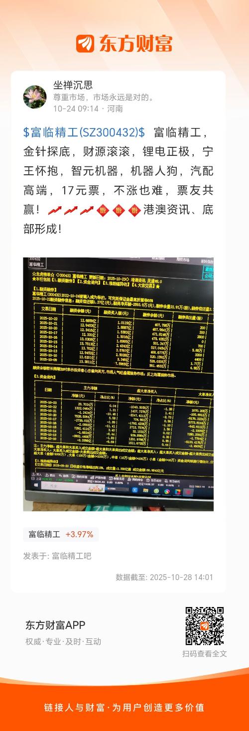 $富临精工(SZ300432)$ 富临精工,金针探底,财源滚滚,锂电正极,宁王怀抱,智元机器,机器人狗,汽配高端,17元票,不涨也难,票友共赢!