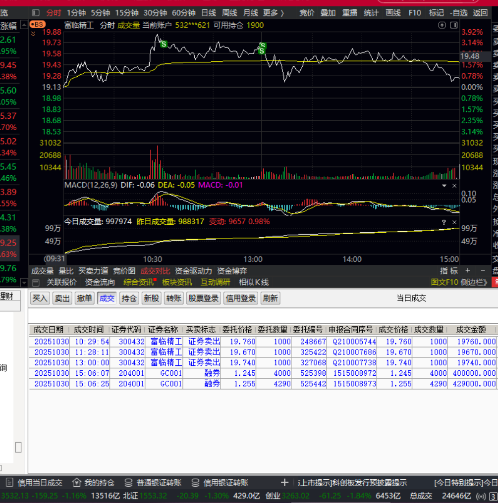 这股本来买的不多,27号建仓就买了5千股试水,今上午高抛了大部分,但尾盘跳水没接回。原因不太方便说。看图理解吧。红色标注的都是重要信息,串起来就能明白。我只能说我们的股市就是玻璃心,指数上4000之后更是风声鹤唳,一有点不好的苗头资金都在抢跑,比赛看谁跳水跳的帅。富临精工