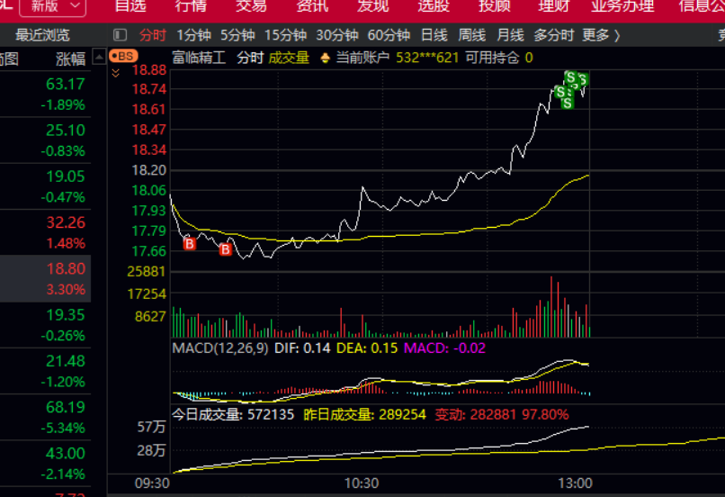 T的很成功,大约T 出来6个点的利润。下午继续涨还是回落就不管了,反正有这6个点保底今天就不会亏钱。我有预感,下午回落的可能性大于继续上涨,毕竟股价距离分时均线太远了。只有那种一直上涨到涨停的票可以无视这个乖离,一般的只要超过3格以上9成都要回落。富临精工