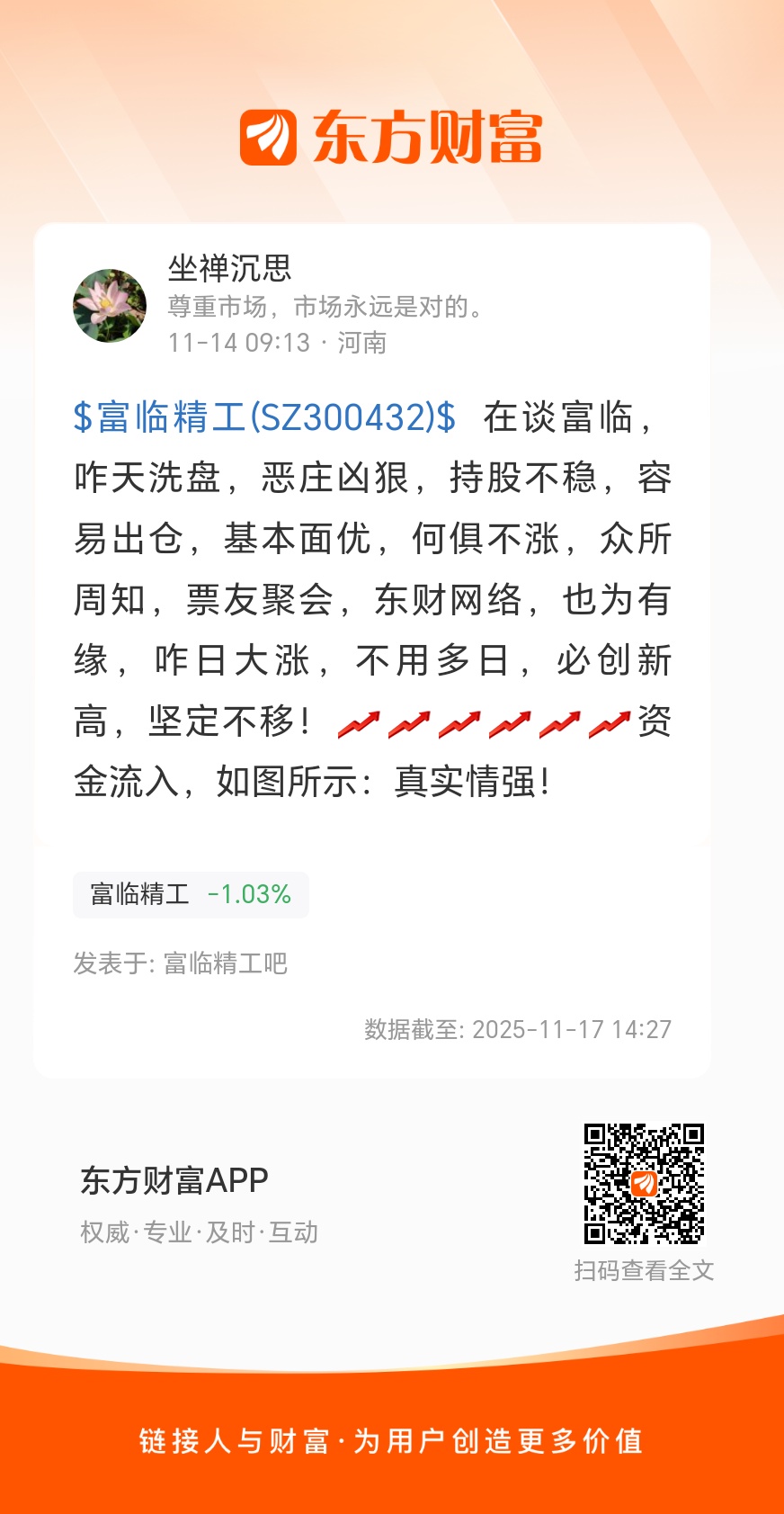 $富临精工(SZ300432)$ 在谈富临,咋天洗盘,恶庄凶狠,持股不稳,容易出仓,基本面优,何俱不涨,众所周知,票友聚会,东财网络,也为有缘,咋日大涨,不用多日,必创新高,坚定不移!