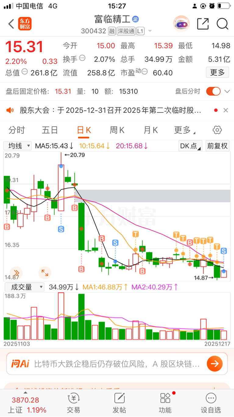 $富临精工(SZ300432)$ 满仓1个就是被动。又套了好几个月了,唯一的愿望又是解套。现在也只能几分钱做差价了。