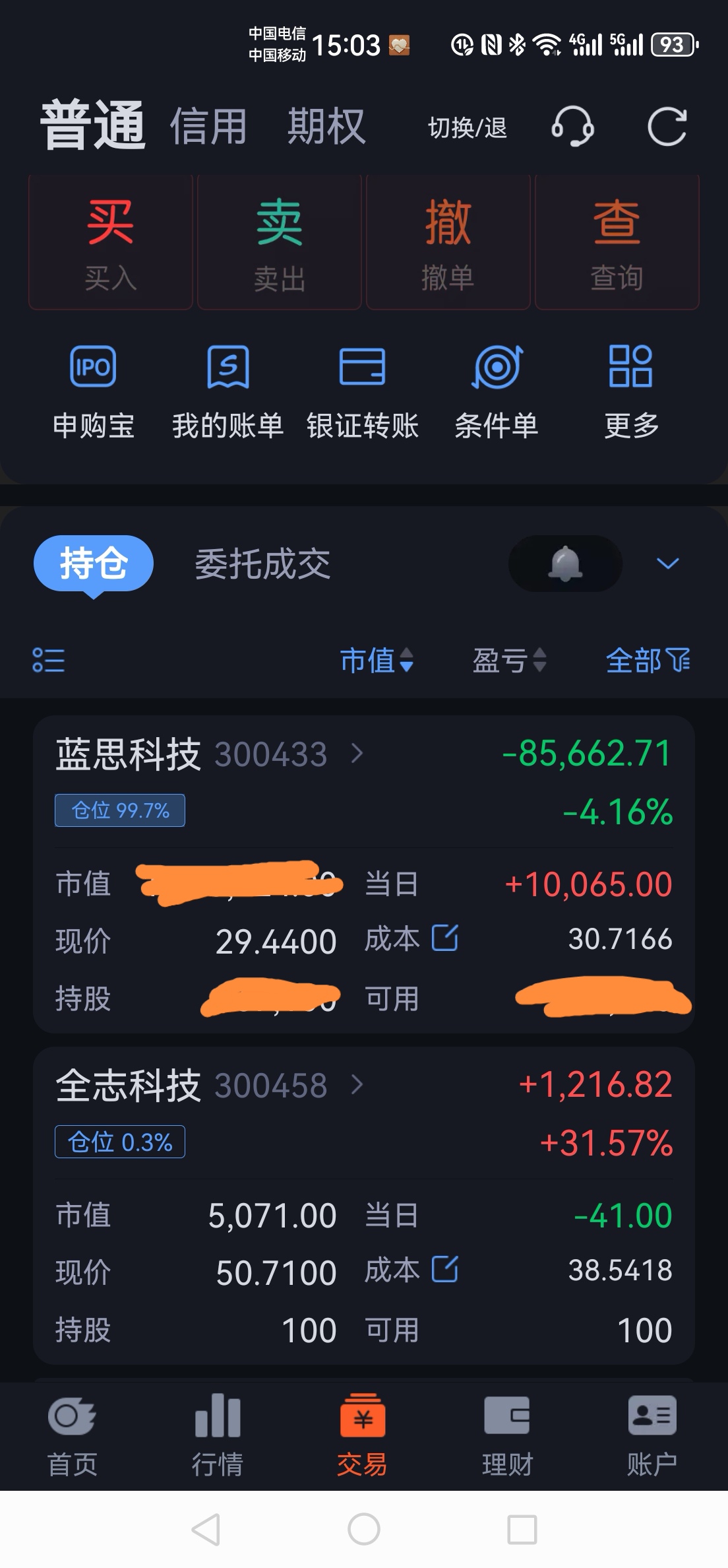 刚才一个资深金融消费者安慰我说牛市急跌不用担心,说不定下午就会拉升起来,想想也是有道理,短短四天在蓝思身上已经亏了二十多个点(从盈利20多w到现在亏损10多w),希望下午能翻红,毕竟我是奔着40+去的!