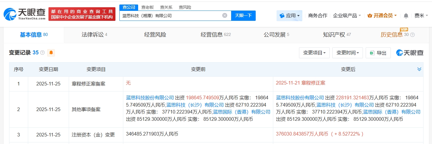 南方财经11月26日电,天眼查工商信息显示,近日,蓝思科技(湘潭)有限公司发生工商变更,注册资本由约34.65亿人民币增至约37.6亿人民币,增幅约9%。蓝思科技(湘潭)有限公司成立于2012年7月,法定代表人为周群飞,经营范围包括第二类医疗器械生产、移动终端设备制造、通信设备制造、智能车载设备制造、集成电路制造等。股东信息显示,该公司由蓝思科技(300433)、蓝思国际(香港)有限公司、蓝思科技(长沙)有限公司共同持股。值得一提的是,此前,蓝思科技(长沙)有限公司发生工商变更,注册资本由约31.03亿美元增至约34.57亿美元,增幅约11%。