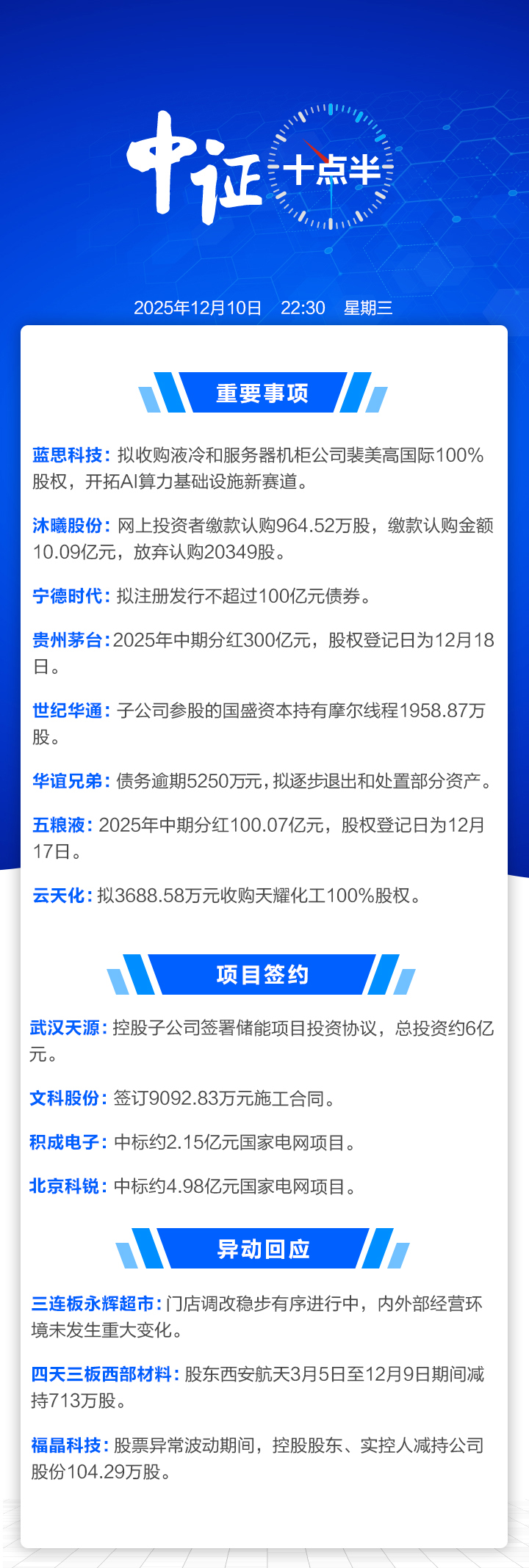 【中证十点半】蓝思科技拟收购裴美高国际100%股权;三连板永辉超市回应异动