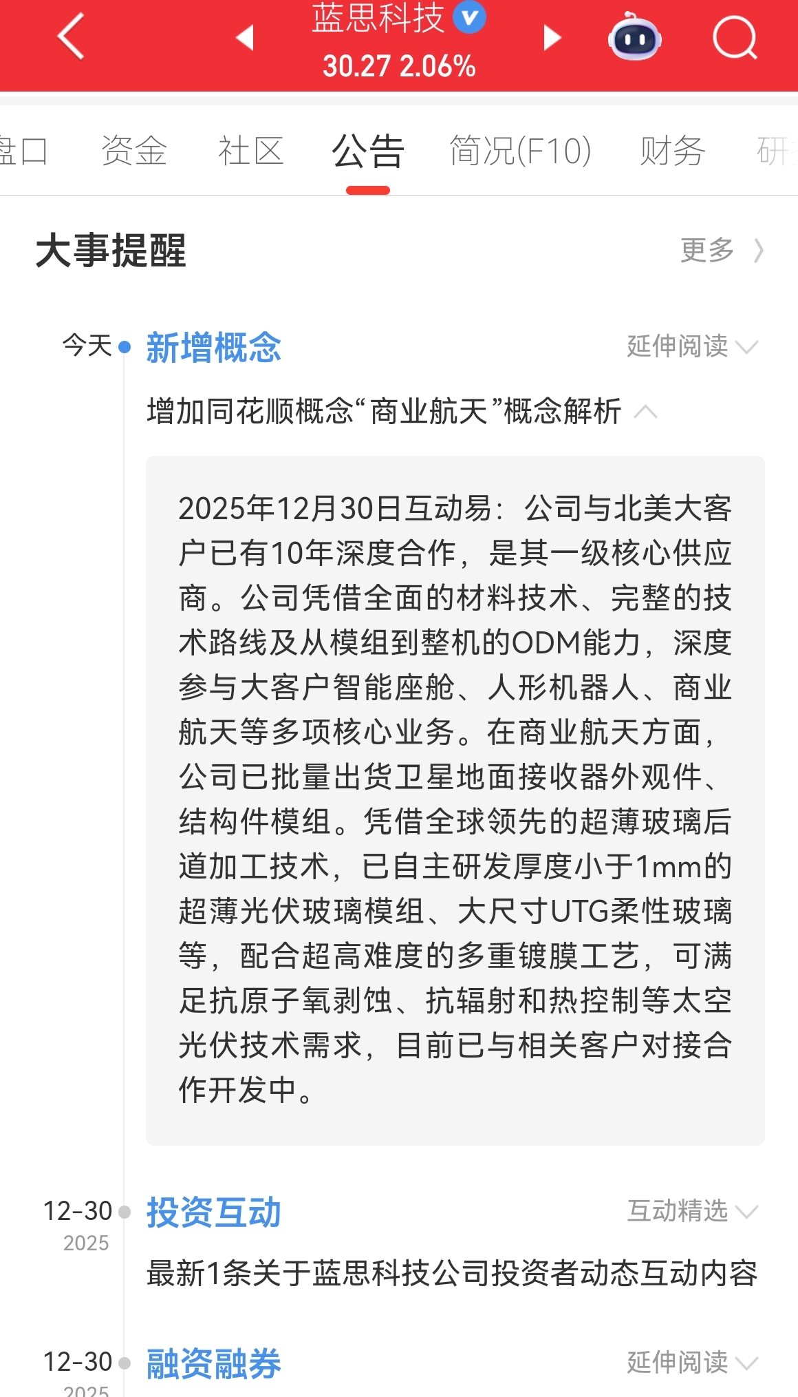 $蓝思科技(SZ300433)$ 队友那边加了商业航天概念,早不加,这个时候加,要是节后航天回调,不得吃大砍刀?服了,涨不跟,到时候跌的时候就最正宗了