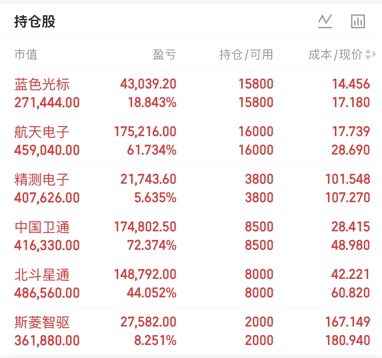 小当家70.1%仓位精准拿捏大牛股,收益炸裂全场:中国卫通涨停不停歇,持仓狂赚72%,与中国卫星并称的“航天双子星”续写神话;航天电子11月24日至今暴涨160%,火箭遥测产品90%市占率构筑绝对壁垒,持仓收益62%仍在加速冲顶AI应用龙头蓝色光标单日狂飙14%,B l u e AI引擎12亿营收打底,仓位收益近19%再掀主升;斯菱智驱12月25日以来怒涨70%,今日震荡后强势拉回,筹码锁仓纹丝不动,持仓盈利8%+仅是开胃菜;北斗星通、精测电子良性调整不改强势本色,前者沿5日线稳健前行,后者手握5.7亿大单+311%业绩预增,金叉形态暗藏大机会!
