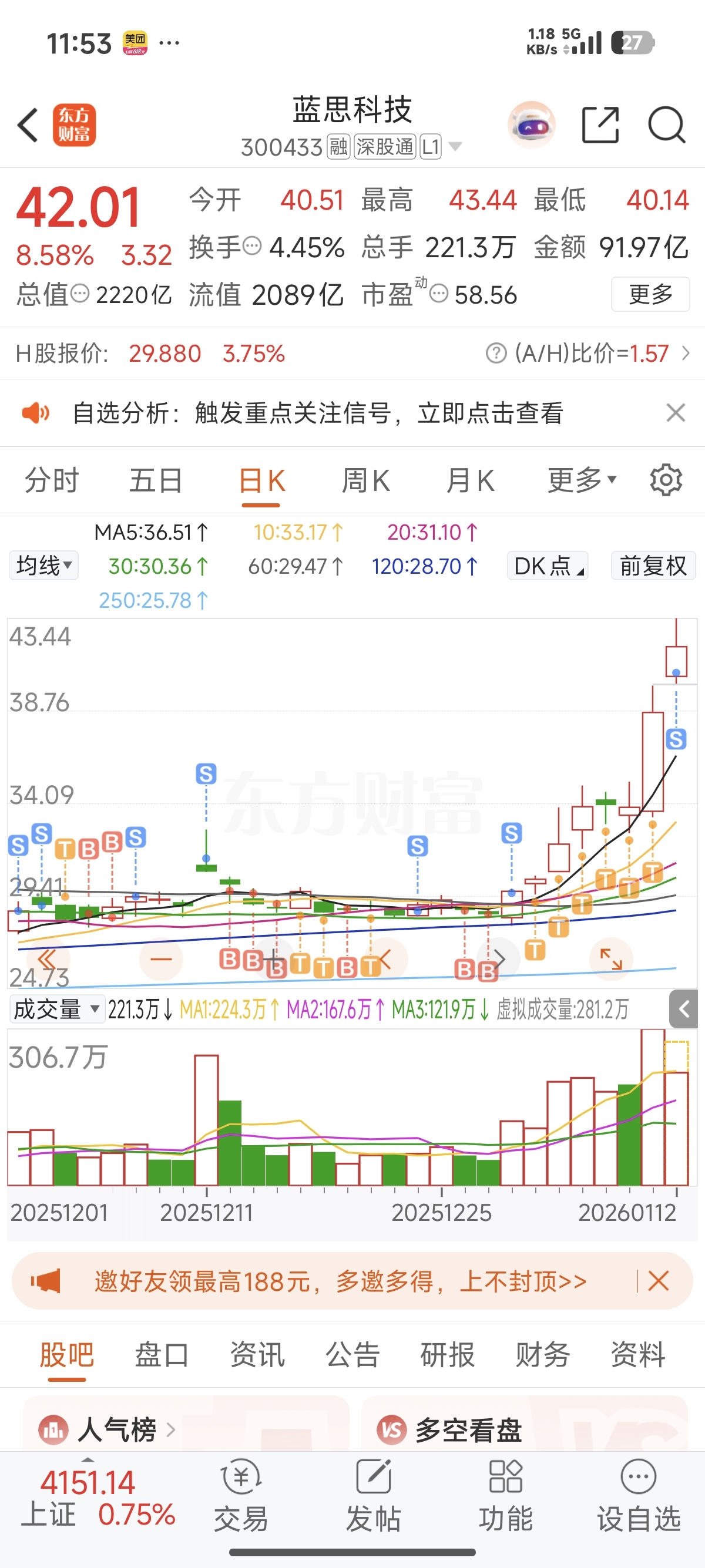 $蓝思科技(SZ300433)$ 难道我要卖飞今天?目前还没买回来!
