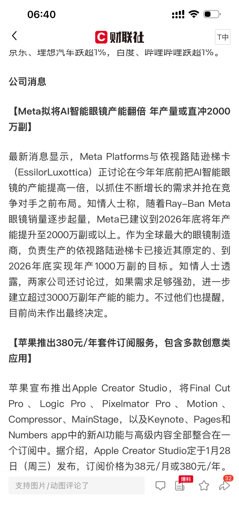 $蓝思科技(SZ300433)$ 今天炒Ai眼镜