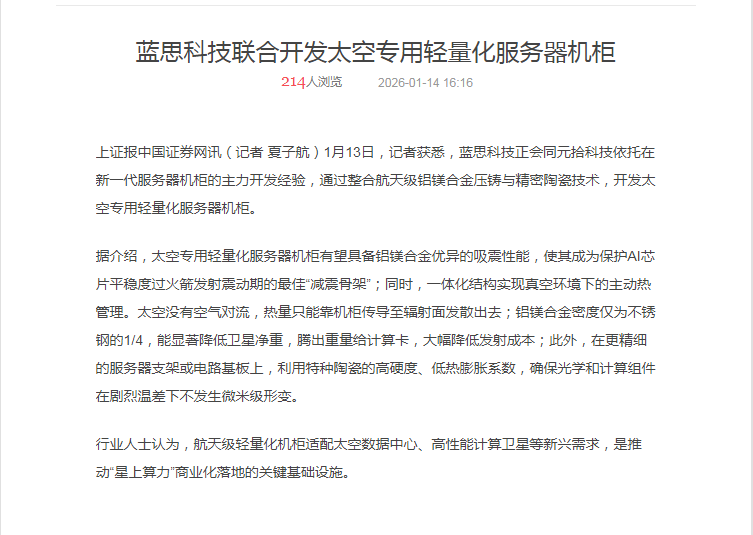 蓝思科技联合开发太空专用轻量化服务器机柜