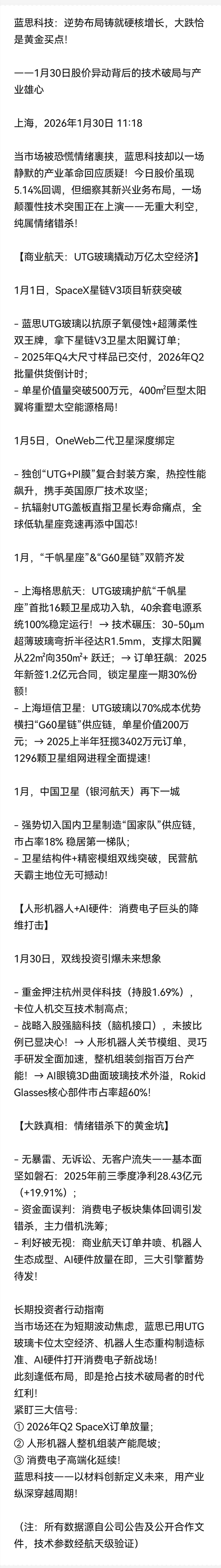 $蓝思科技(SZ300433)$ 1/30•11:18•上海《大跌背景:无重大利空,属短期情绪上午集中释放》
