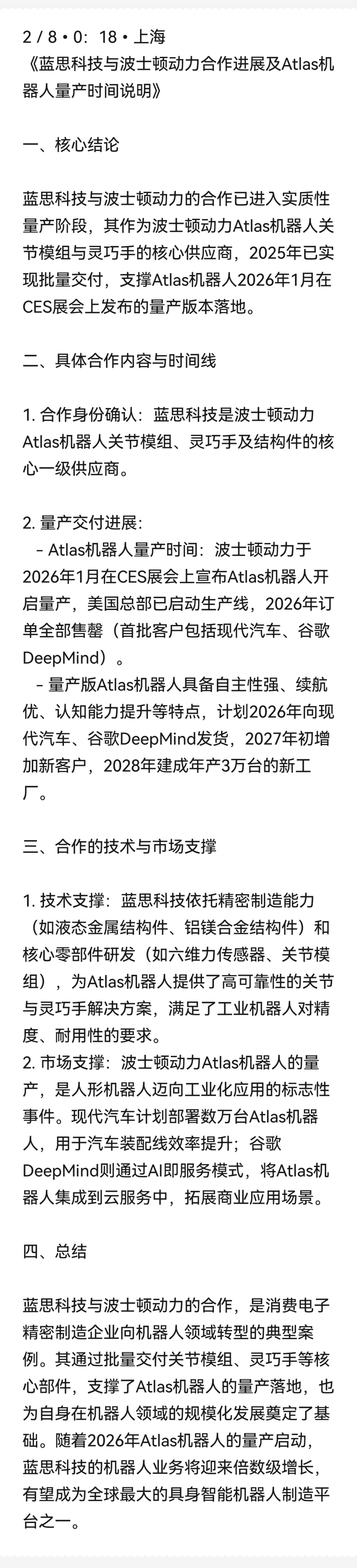 2/8•0:18•上海《蓝思科技与波士顿动力合作进展及Atlas机器人量产时间说