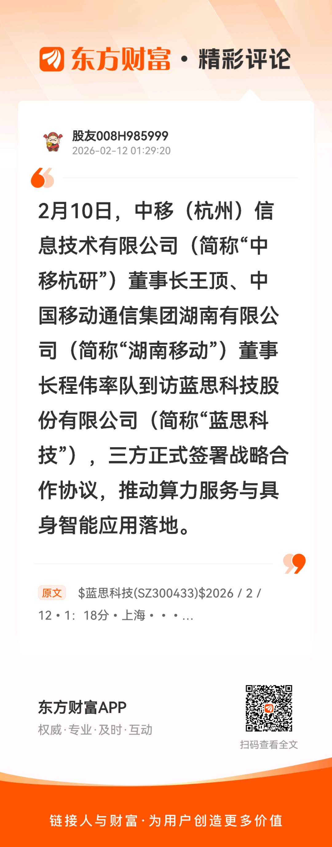 //@股友008H985999 :2月10日,中移(杭州)信息技术有限公司(简称“中移杭研”)董事长王顶、中国移动通信集团湖南有限公司(简称“湖南移动”)董事长程伟率队到访蓝思科技股份有限公司(简称“蓝思科技”),三方正式签署战略合作协议,推动算力服务与具身智能应用落地。