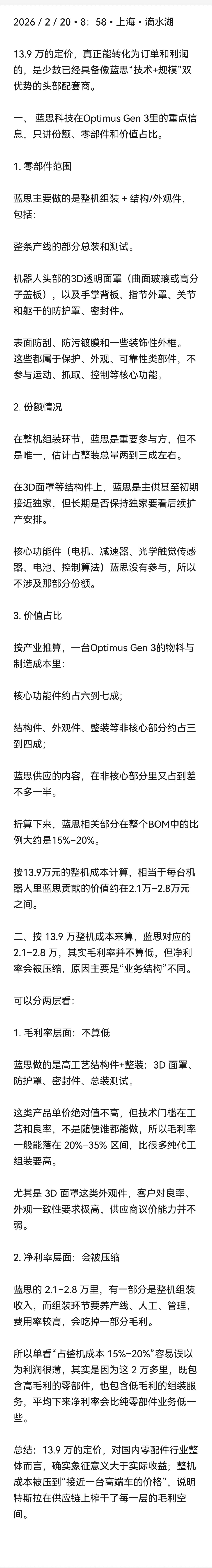 $蓝思科技(SZ300433)$ 2026/2/20•8:58•上海•最新•特斯拉Optimus Gen 3成本压至售定价13.9万元。13.9万是什么概念?一个流水线工人干5年的工资。而这台机器人充一次电能干8小时,用电成本0.3元一小时。富士康深圳工厂已经开始试点,准备拿它替掉40%的质检岗位。比亚迪更狠,直接预订了2000台,专门用来组装电池。