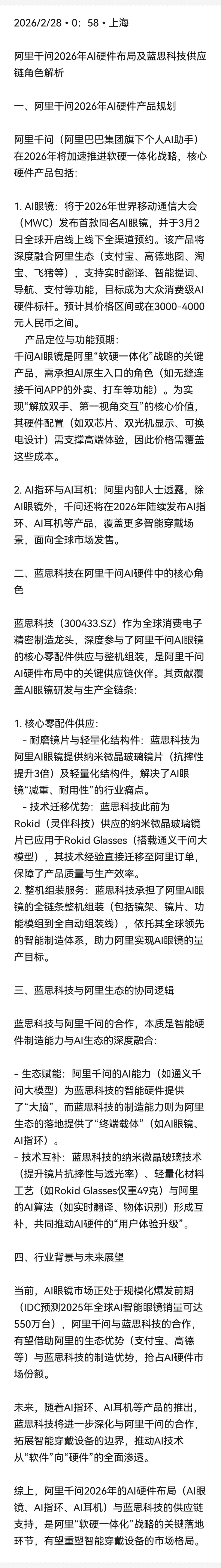 2026/2/28•0:58•上海………蓝思助力•阿里千问AI眼镜(阿里巴巴集团