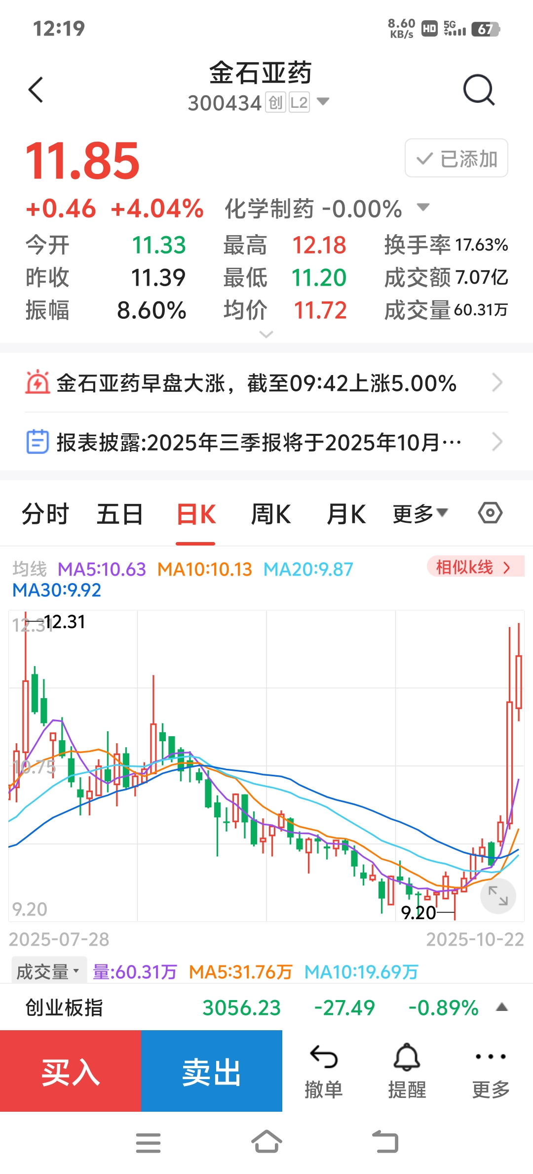 量价齐升的金石亚药:明天晚上九点公布三季报数据,是去是留各位好自为之吧!盈亏自负