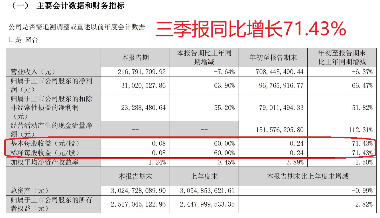 三季报出来了:每股收益0.24元同比增长71.43%业绩符合预期!