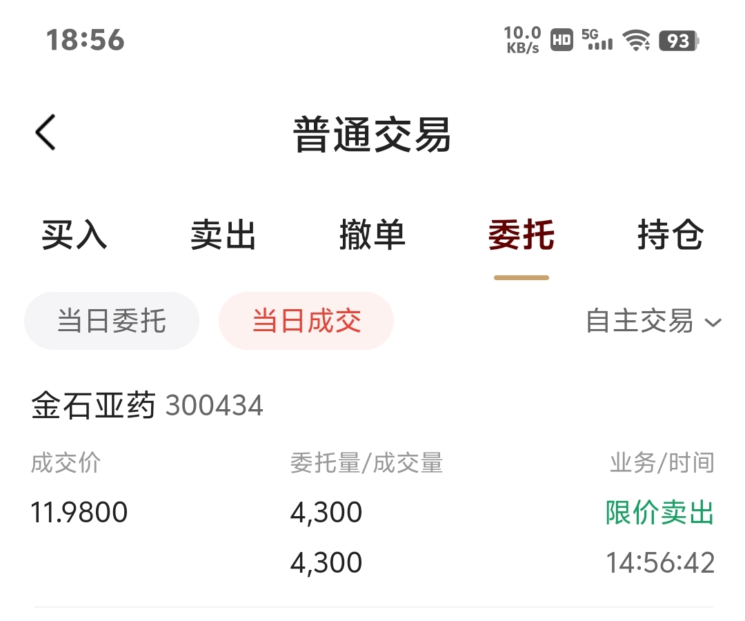 最后4300股金石亚药也都卖了:成交价格11.98元。祝留下来的股友一路顺风、好