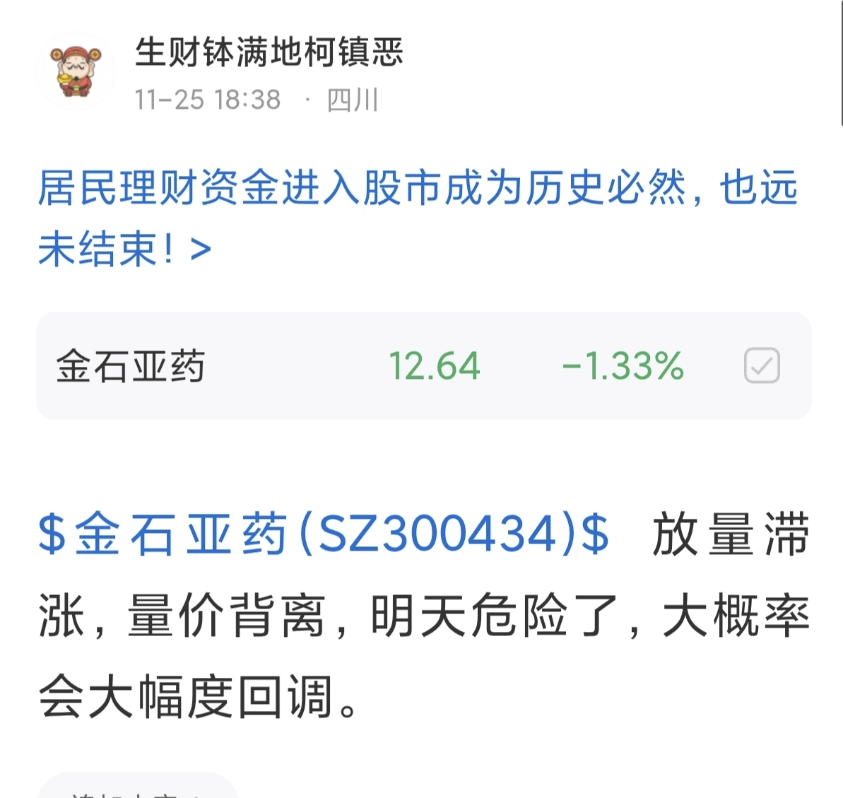 $金石亚药(SZ300434)$ 昨天就已经是量价背离,化学制药板块更是在高位,今天拉高出货很明显,后续连续阴跌可能性非常大,看到8元。
