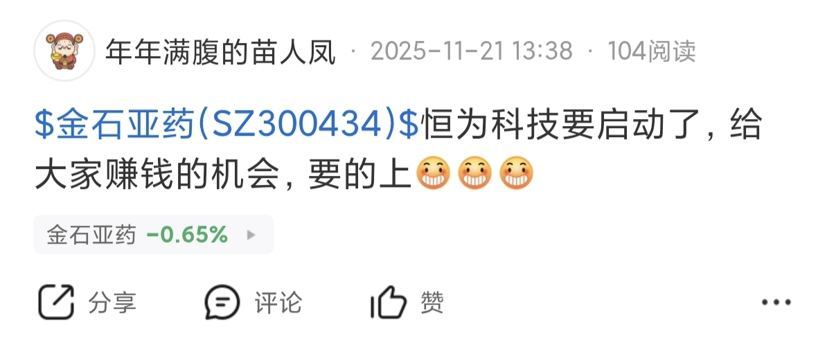 $金石亚药(SZ300434)$ 27叫大家买恒为科技,现在35元了,买了的朋友请给自己一个掌声,6-7元再回来买金石亚药