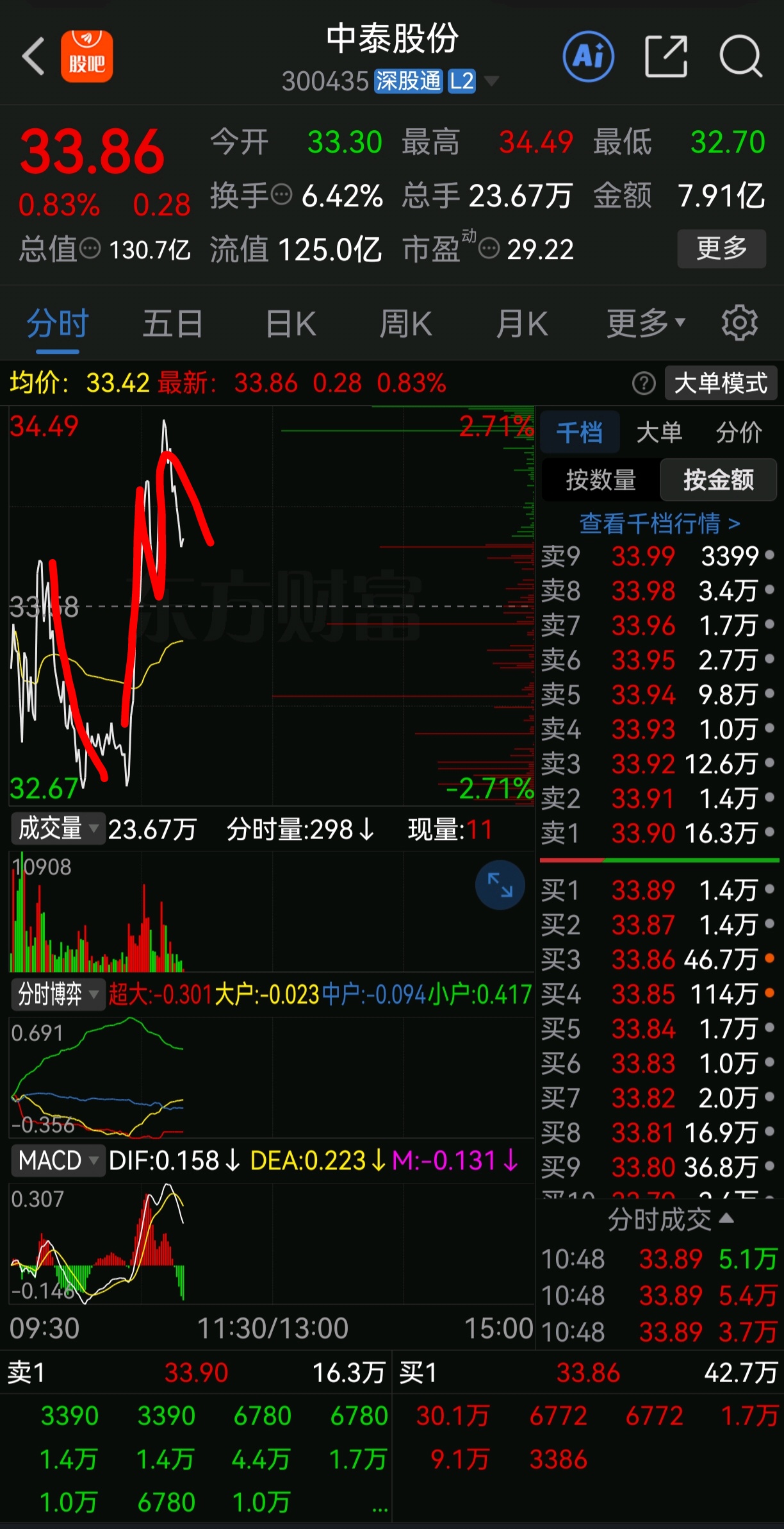 $中泰股份(SZ300435)$ 中泰有一股资金想做多拉起来,但是卖盘太大了,几次拉升后都被砸下来,愿意承接资金很少,主要还是没有辨识度,大资金不认可,这种百亿的大票要想起来必须要市场大资金一致性的合力进场买入,要有大成交量才可以,目前看中泰还是没地位。