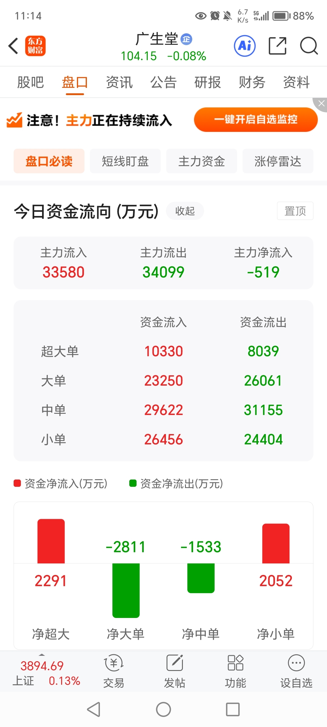$广生堂(SZ300436)$ 主力卖出资金差从五六千万变成几百万。上下振,现在吸筹码