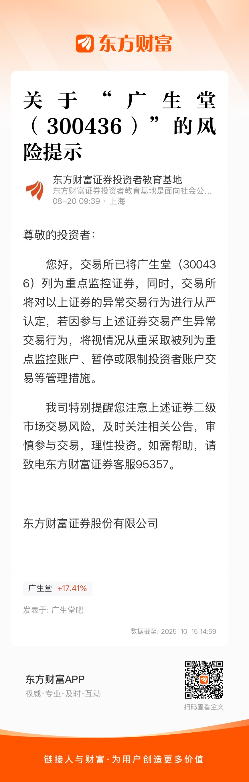 我司特别提醒您注意上述证券二级市场交易风险,及时关注相关公告,审慎参与交易,理性投资。如需帮助,请致电东方财富证券客服95357。