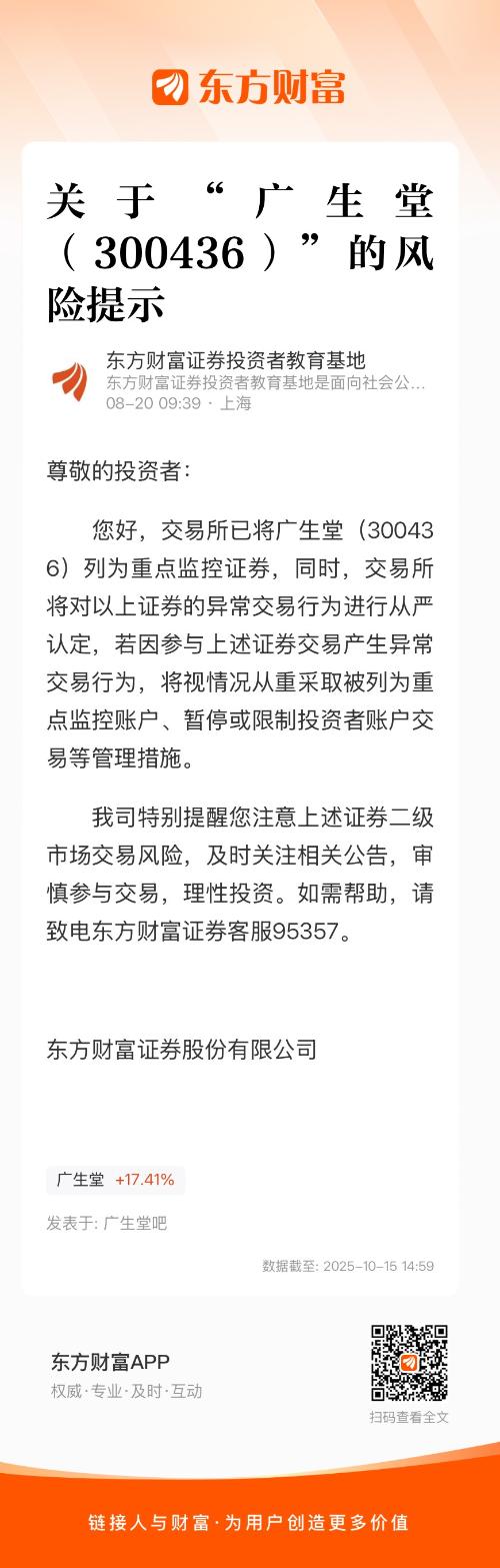您好,交易所已将广生堂(300436)列为重点监控证券,同时,交易所将对以上证券的异常交易行为进行从严认定,若因参与上述证券交易产生异常交易行为,将视情况从重采取被列为重点监控账户、暂停或限制投资者账户交易等管理措施。