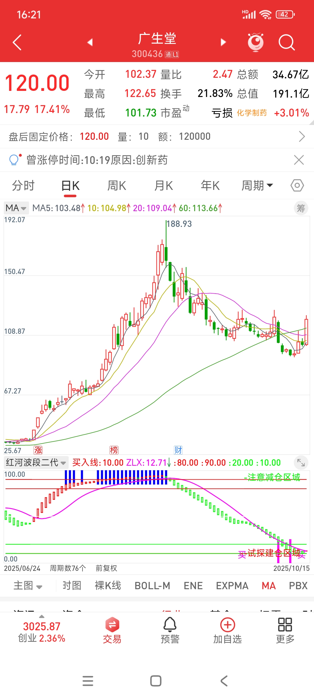 $广生堂(SZ300436)$ 底部出现买字以后,今天终于在底部绿柱转红柱做确认了,这里可以看一波反弹,反弹到什么时候?小级别到顶部以后红柱转绿柱就撤就行。