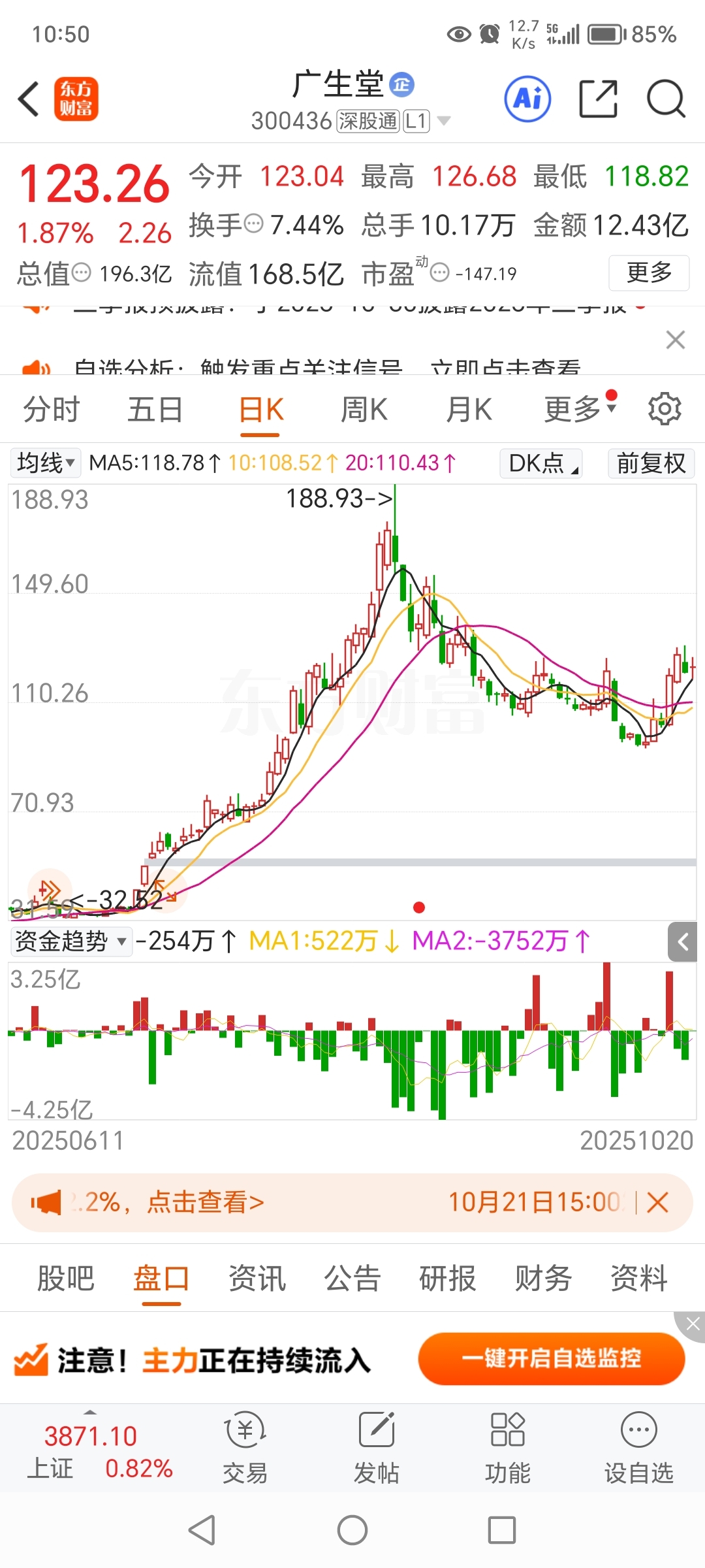 $广生堂(SZ300436)$ 主力卖出资金差从三千万变成两百万。股价在均线已经稳住,只是受上星期大跌影响。证明主力看好之股已控盘。股数配合升势可期。小散们吃肉的时间到。