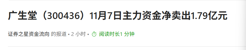 广生堂(300436)11月7日主力资金净卖出1.79亿元