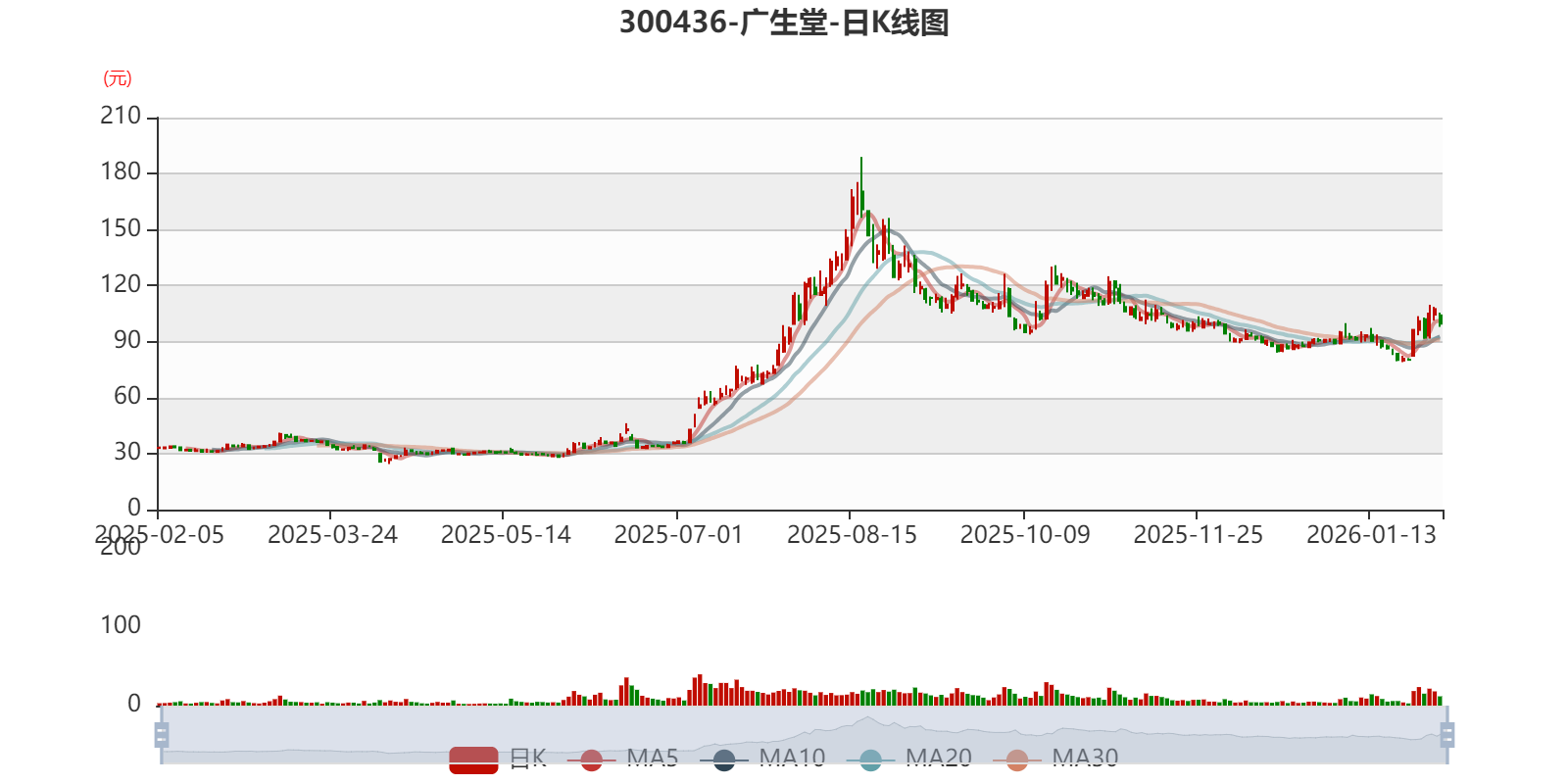 中证智能财讯广生堂(300436)1月30日晚间披露2025年度业绩预告,预计2025年归母净利润亏损1.7亿元至2.4亿元,上年同期亏损1.56亿元;扣非净利润亏损1.78亿元至2.48亿元,上年同期亏损2亿元。以最新收盘价计算,市净率(LF)约41.43倍,市销率(TTM)约36.83倍。