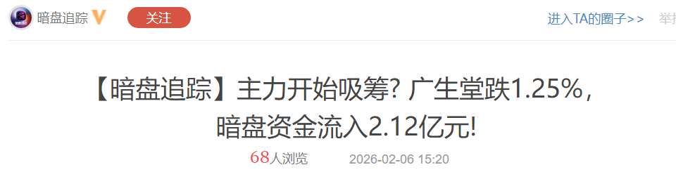 主力开始吸筹?广生堂跌1.25%,暗盘资金流入2.12亿元!