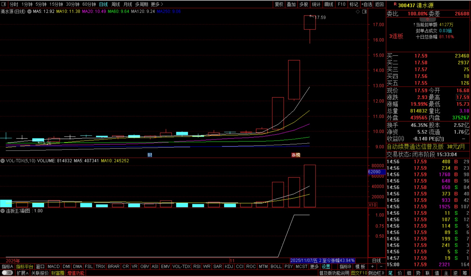 龙抬头连板王战法,300437清水源11月7日一开盘就被连板王捕捉到了,当天走出