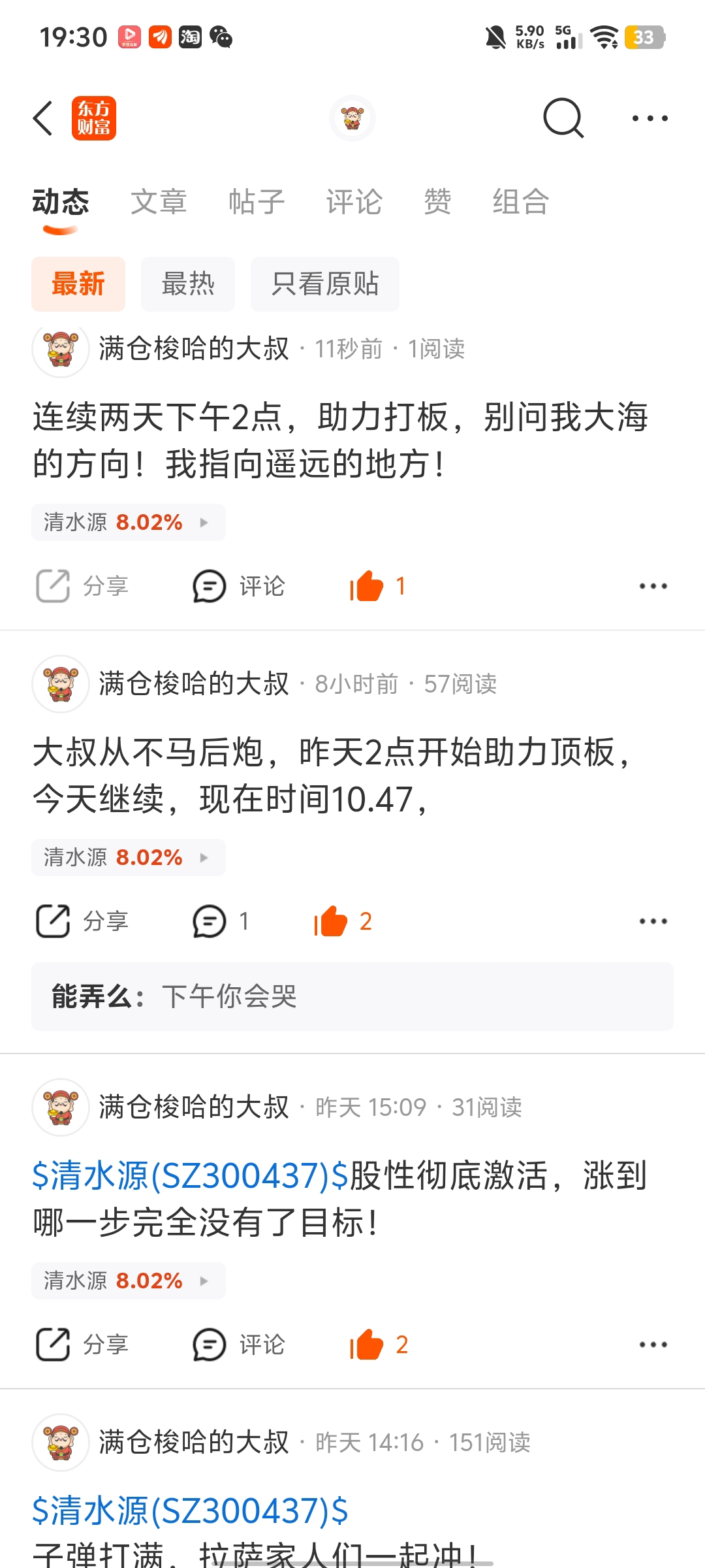 $清水源(SZ300437)$ 不好意思,昨天有事没有看股,今天大叔继续加仓,继续助力顶板!