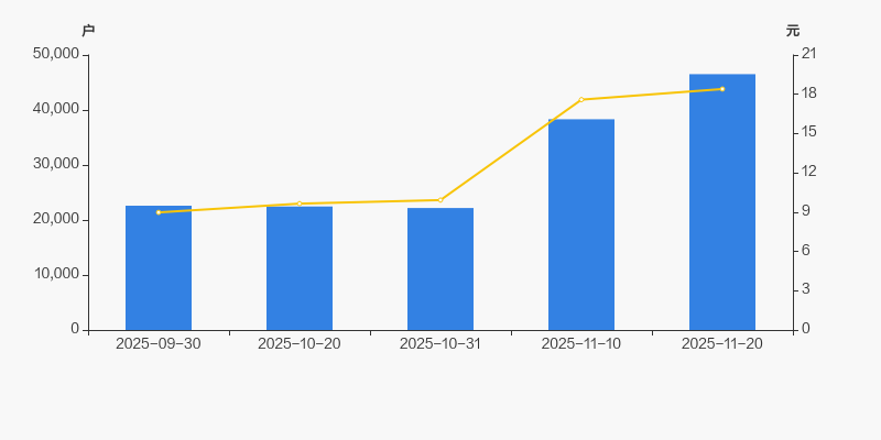 2025年9月30日至今,公司股东户数成倍增长,区间涨幅达105.84%。2025年9月30日至2025年11月20日区间股价上涨104.90%。