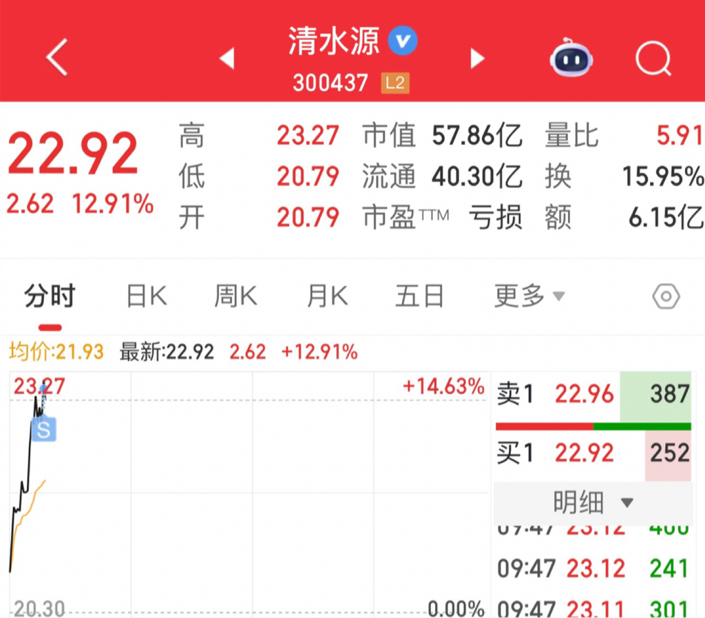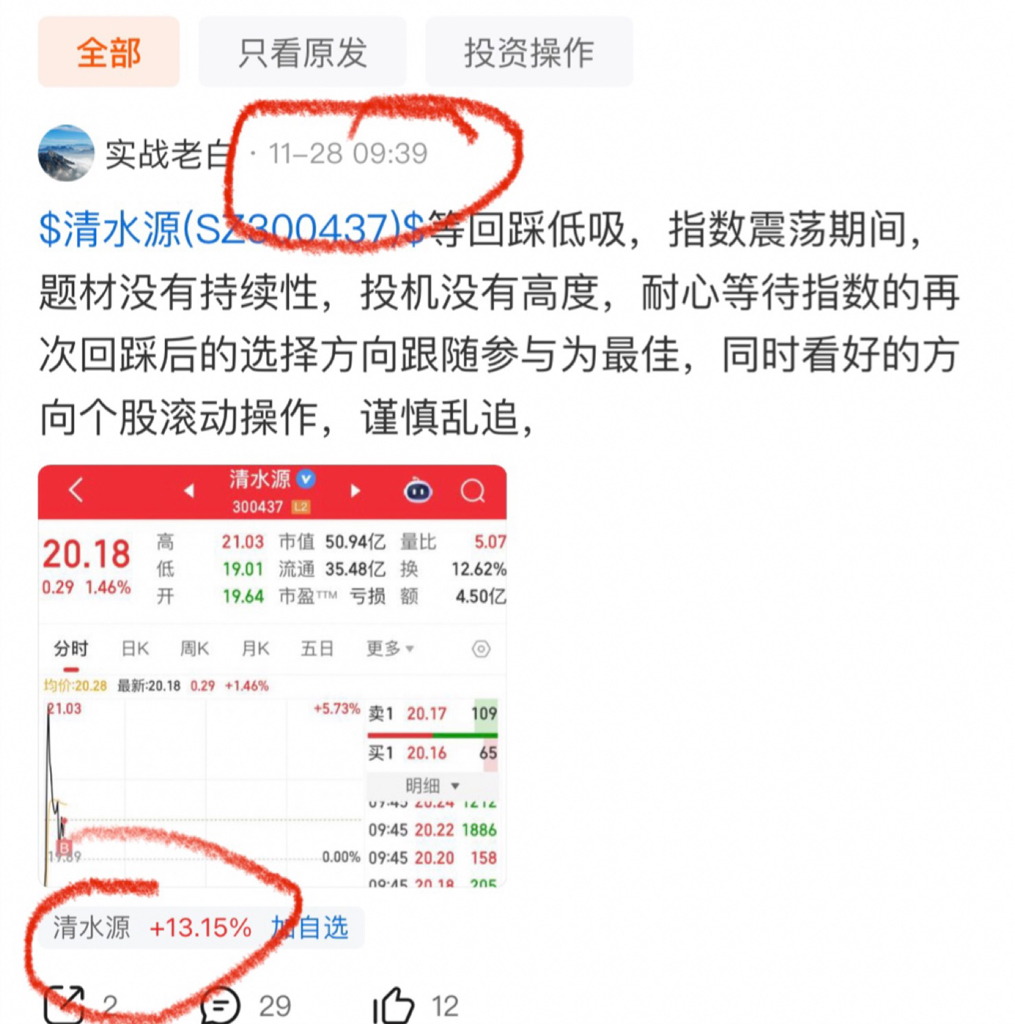 $清水源(SZ300437)$ 短线1个交易日老白落袋为安14个点到手,留下来的朋友发财,市场目前处于混沌期,周五缩量反弹时跟随拉升的板块是商业航天,板块出现在月末叠加月初,这个方向观察一下持续性,看是否出现竞价大单一字定方向,同时也要防止过于一致时被先兑现,指数继续下探的概率有限,大胆假设小心求证