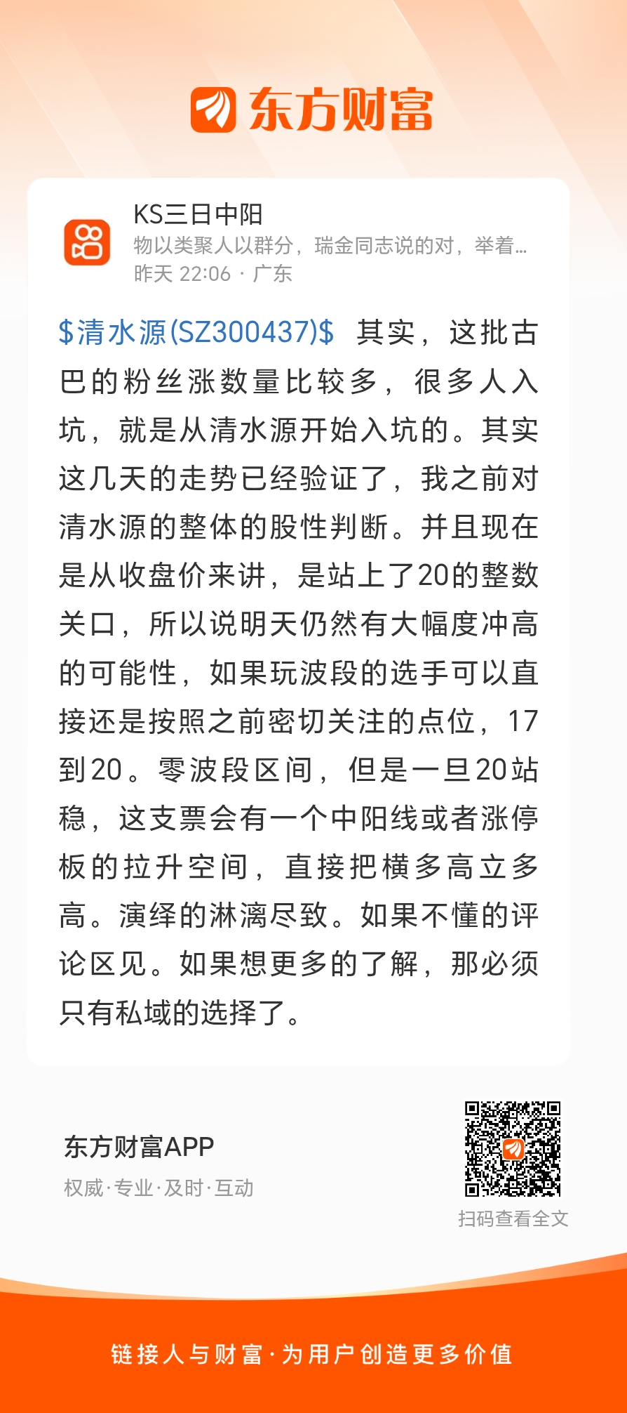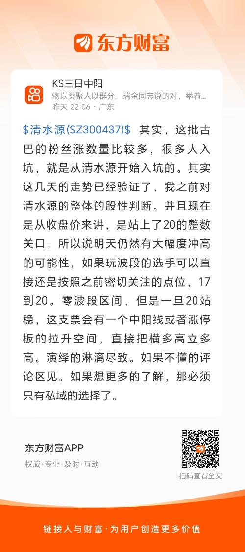 $清水源(SZ300437)$ 其实,这批古巴的粉丝涨数量比较多,很多人入坑,就是从清水源开始入坑的。其实这几天的走势已经验证了,我之前对清水源的整体的股性判断。并且现在是从收盘价来讲,是站上了20的整数关口,所以说明天仍然有大幅度冲高的可能性,如果玩波段的选手可以直接还是按照之前密切关注的点位,17到20。零波段区间,但是一旦20站稳,这支票会有一个中阳线或者涨停板的拉升空间,直接把横多高立多高。演绎的淋漓尽致。如果不懂的评论区见。如果想更多的了解,那必须只有私域的选择了。